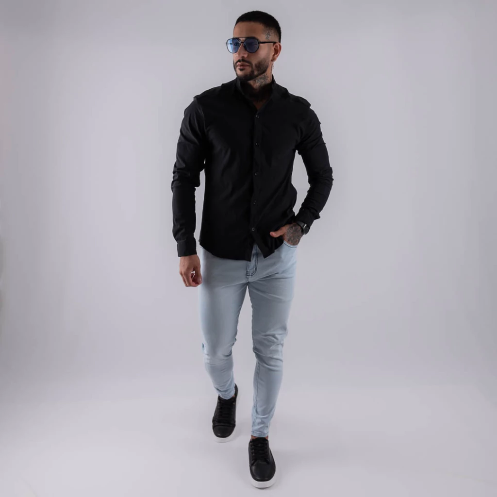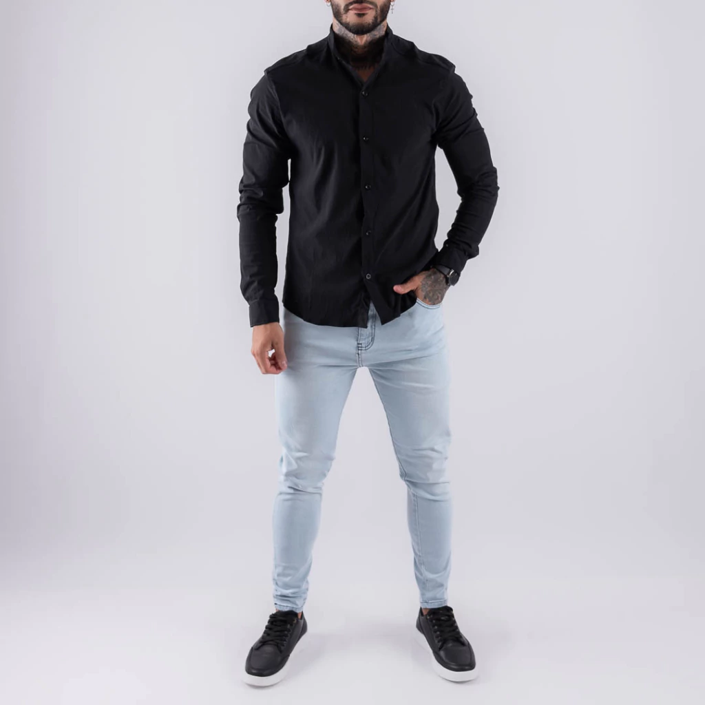 Destaca con nuestra camisa negra de cuello mao! Esta prenda combina estilo y confort en un diseño elegante. Confeccionada en poplín elastizado, esta camisa ofrece una sensación suave y elástica que garantiza comodidad durante todo el día. Con su ajuste slim fit, esta camisa resalta tu figura de manera favorecedora. El cuello mao añade un toque de sofisticación moderna a tu atuendo. Perfecta para ocasiones formales o informales, esta camisa negra es una opción versátil para tu guardarropa.